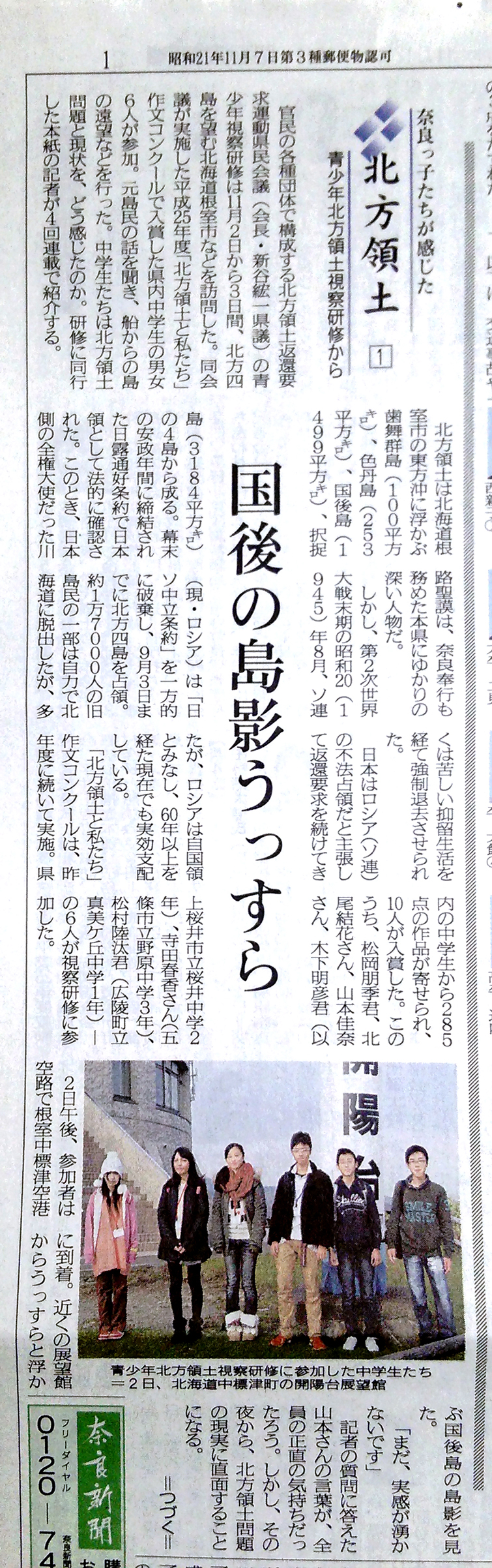 - 少年少女北方領土現地視察研修 奈良新聞に掲載していただきました。part2