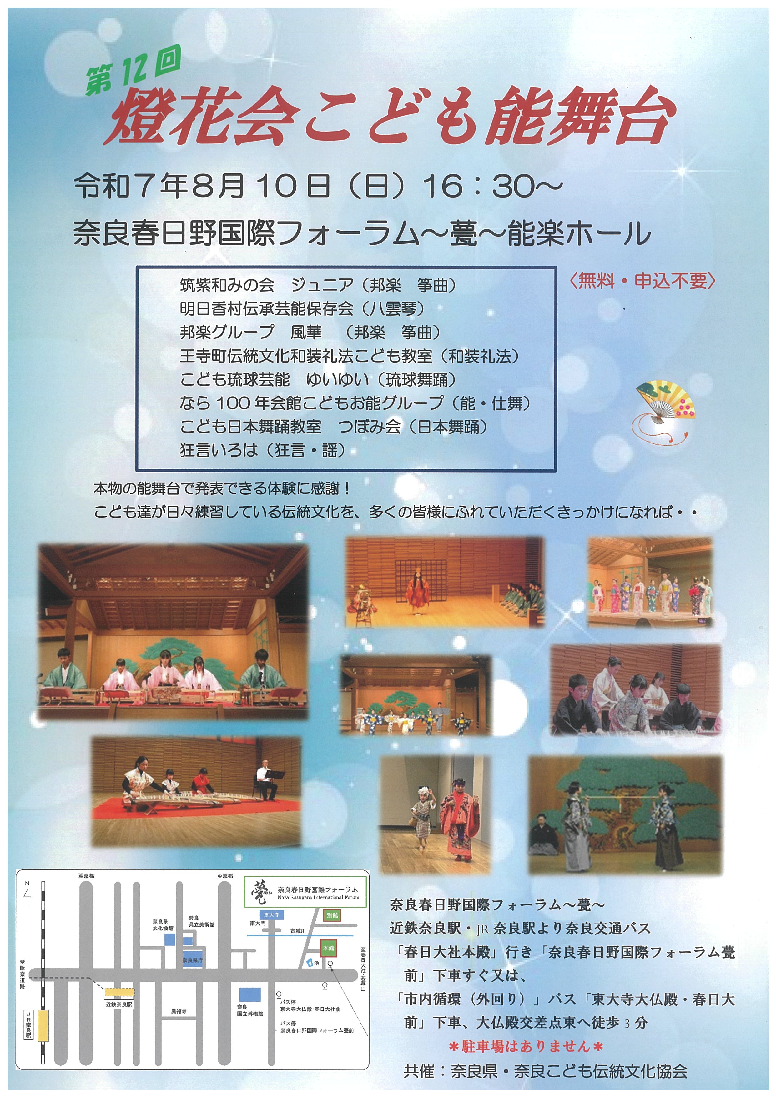 県内各地域で伝統文化を学ぶこどもたちのグループが、本格的な「能舞台」を使って日頃の練習成果を披露します。8月5日~8月14日は奈良公園一帯で「なら燈花会」が行われ、当館でも玄関前広場にて飲食物の販売や、庭園のライトアップが行われます。「なら燈花会」とともに、能舞台でのこどもたちの発表をぜひお楽しみ下さい。〈入場無料、事前申込不要〉