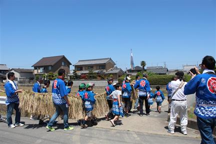 矢部の綱かけは毎年5月5日に、当地の各班の当屋を中心に行われる行事です。当日は村の役員や綱を持つ人達が伊勢音頭をはやしながら、当屋宅を出発して村中を練り歩きます。ミニチュアの農具や牛の図の木版刷り、稲苗を入れた竹かごが綱の先頭に付けられ、慶事のあった家には綱を持ち込んで家人に巻きつけます。最後に集落の南の小字ツナカケにある木に綱がかけられます。参加者は、かけられた綱の前に整列し、僧侶が導師となって経が唱えられます。終了後、ミニチュアの農具と牛の図の木版刷りが各戸に配られます。