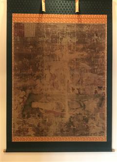 縦164.8cm、横137.6cm、絹の生地に色つきで釈迦の入滅の情景が描かれるものです。現在は、奈良国立博物館に寄託されています。制作年代は記されていませんが、釈迦が右手を枕にせず身体に添わせること、寝台の右側面が描かれること、会衆の人数が少なく、動物は獅子だけが描かれることなど、鎌倉時代以前の涅槃図の特徴があり、平安時代後期の作と考えられます。涅槃図は釈迦の入滅した2月15日に行われる涅槃会の本尊として掲げられます。達磨寺の涅槃図は画面の下方に釈迦が描かれており、涅槃会に集う人々が涅槃の時を追体験するしかけと考えられます。明治45年(1912年)に国の重要文化財に指定されています。