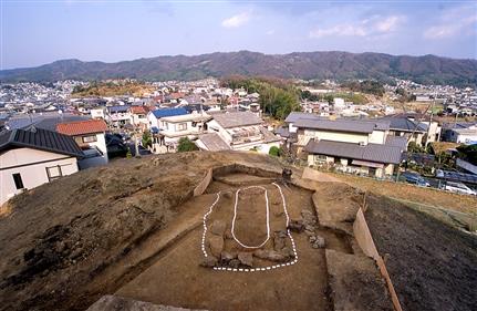 生駒山地から東に派生する尾根の先端付近に築造された直径約23mの円墳。築造時期は5世紀後半と考えられています。発掘調査により、埋葬施設には竪穴式から横穴式への過渡期の特徴を示す初期の横穴式石室が採用されていたことが明らかになりました。出土した馬具や甲(よろい)の製造技法などから、被葬者とその背後に、大陸との関わりをうかがわせる先進的な性格をもった集団の存在が想定されています。