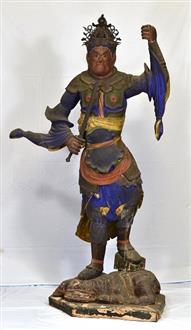 木造二天王立像は本尊の十一面観音像の両脇を護る天部像2躯です。口を開いている方を開口像、閉じている方を閉口像と呼び分けています。開口像は頭体幹部を通して一材より彫出し、両耳後ろを通り、左脚はふくら脛半ば、右脚は脚後方に抜ける線で前後に割矧いで、内刳りのうえ、襟際で割首するとみられます(一木割矧造り)。閉口像は頭体幹部を通して一材より彫出し、左耳中央及び右耳後方を通り、左脚はふくら脛半ば、右脚は脛中央に至る線で前後に割矧いで、内刳りのうえ、襟際で割首するとみられます。いずれも表面には彩色が施されています。制作年代は同じく平安時代後期と考えられます。