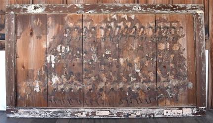 絵馬は縦100.0センチ、横176.7センチを測る大絵馬で、縦長6枚の板を裏面で桟を打ち付け合わせて1面としています。