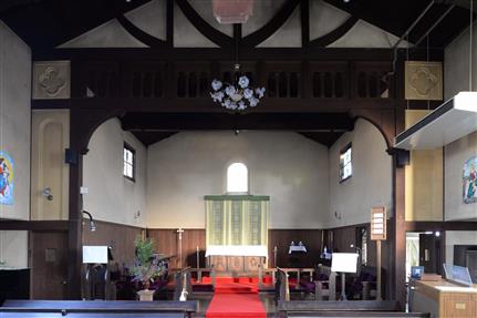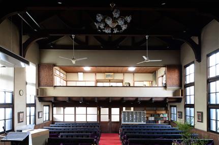 会堂は、桁行19.15m、会衆席(かいしゅうせき)の梁間8.6m、木造2階建、切妻造桟瓦葺(きりづまづくりさんがわらぶき)となっています。1階の平面は、東西に長い十字型の平面を基調とし、東側のチャンセル(内陣)と、その西側の会衆席を併せて礼拝堂としています。2階は、西半を27畳の和室、東半を吹き抜けとなっています。和室の礼拝堂側は一面に襖を入れ、開放時は両端の戸袋にすべて格納することで礼拝堂と一体の空間となり、桟敷席(さじきせき)として機能しています。