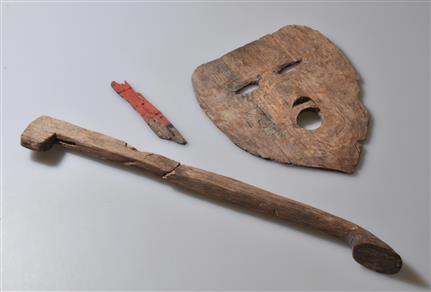 【木製仮面】長さ26cm、幅21.6cm、厚さ0.6cm。アカガシ亜属の柾目材で作られた鍬の身を転用したもので、鍬身の刃縁側を頭、基部側を顎としています。