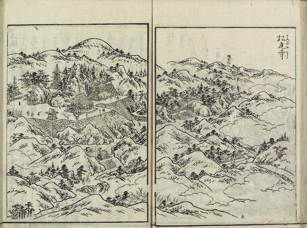 松尾寺は、松尾丘陵の南端に位置する松尾山の中腹にある寺です。718年、当時42歳だった舎人親王(天武天皇の皇子)が、日本書紀の無事完成と、自身の厄除けを願って建立したと伝えられる、日本最古の厄除霊場です。図会からは、山岳寺院として急峻な斜面の上に建てられた様子が分かります。石段を登り詰めた所にある本堂は、1337年に再建されたものですが、希少な大型仏堂として重要文化財となっています。また、本堂の裏手にある神霊石の大岩は、図会に描かれた当時のまま残されています。