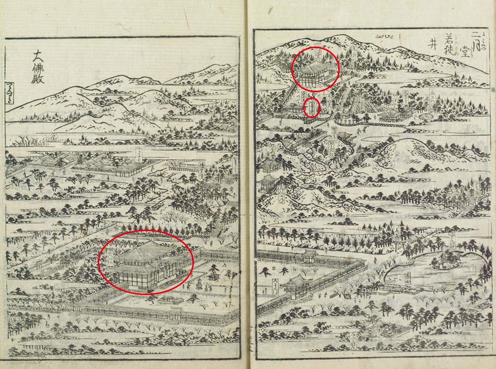 東大寺の二月堂は、旧暦2月に「お水取り(修二会)」が行われることからその名が付いています。二月堂は天平勝宝4年(752年)に創建されましたが、寛文7年(1667年)に失火により焼失しました。図会に描かれているものは、その2年後に再建されたものです。二月堂の下には若狭井(わかさのい)が描かれており、「お水取り」ではこの若狭井からくみ取った香水を本尊に供えます。この「水を服すれば、諸病の悩みをまぬがるる」(大和名所図会巻之一)と伝えられています。なお、図会の左下には大仏殿が描かれていますが、これは宝永6年(1709年)に公慶上人によって再興されたものです。