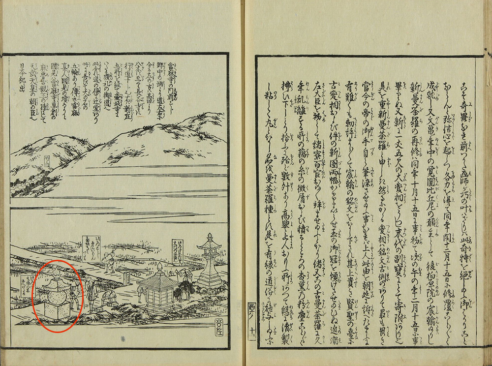 図会は當麻寺の門前を描いています。画の上にある文には「分れ道の傍らに辻堂あり。ここに並びて大の石の五輪あり」と記されており、この五輪塔が今日では當麻蹶速塚と伝えられているものです。當麻蹶速は當麻に住んでいた怪力の持ち主で、普段から「力比べをして自分に勝る者はいない」と豪語していました。ところが、出雲の国に野見宿禰(のみのすくね)という力自慢がいることが分かります。垂仁天皇7年7月7日に、二人は御前で対戦し、當麻蹶速は敗れてしまいました。この対戦が国技相撲のはじまりとされています。