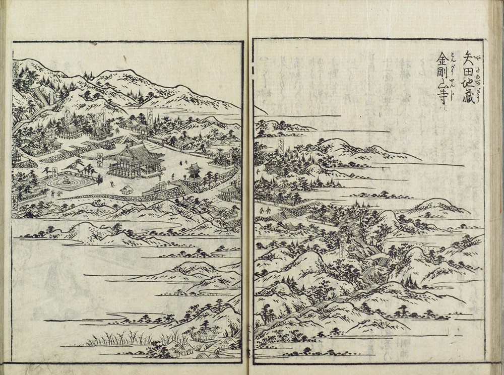 矢田寺(金剛山寺)は、矢田丘陵の東に位置する矢田山の中腹にある寺です。壬申の乱の戦勝祈願のために矢田山を訪れた大海人皇子が、即位後の679年に、智通僧上に命じて建立させました。図会では、山の中腹を造営して建立された様子がよく分かります。図会の右上に「矢田地蔵」とありますが、これは本尊の木造地蔵菩薩立像(重要文化財)を指しており、矢田寺は日本のお地蔵さま発祥の地とされています。また、境内の中心にある本堂は、奈良県指定有形文化財となっています。