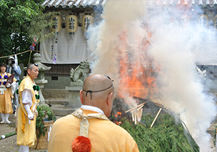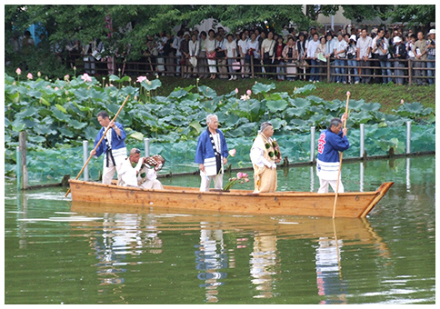 毎年7月7日に、奥田の集落で行われている行事です。奥田の人々が蓮取り舟に乗って、古式にのっとり捨篠池(すてしのいけ)の蓮を切り取ります。行者達の行進や弁天神社での大護摩供を経て、蓮は吉野の金峯山寺へと運ばれます。役行者とその母・刀良売(とらめ)ゆかりの奥田の地に、長きにわたって受け継がれている行事です。