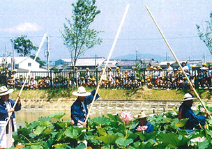 蓮の開花時期は通常はお盆前後ですが、奥田の蓮は行事当日(7月7日)には開花していなければなりません。蓮は育てるのが非常に難しい植物であるうえ、このような厳しい条件のもと、水の世話から肥料やり、草の手入れなど、大字の総代・評議員を中心に奥田の人々がわが子を育てるように、一生懸命に蓮を育てています。華やかな蓮取りの裏には大変な苦労がありますが、「金峯山寺の権現様にお供えする蓮を育てている」という大字奥田の人々の誇りがあるからこそ、このような苦労も乗り越えることができ、蓮取り行事が今日まで続いているといえます。