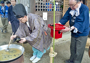 その昔、役行者に恋をしたものの、見向きもされなかった娘が蛇に化けた。驚いた村人が、建水(けんずい。現在でいう間食のこと)として持っていた味噌汁を蛇に掛けて追い払った。――というのが、この祭りの由来です。これに加えて、五穀豊穣のための雨乞いの意味もあったといいます。“蛇曳き”の風習は各地で見られますが、“汁掛け”は珍しく、蛇穴独特の風習といえるでしょう。かつては見物人に味噌汁を掛けていましたが、現在では蛇曳きの出発時に汁掛けの儀式を行うことになっています。