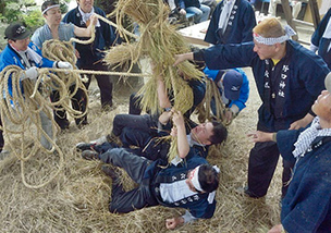 縄で作られた蛇が、汁掛けの儀式を合図に出発し、集落内をくまなく回った後、野口神社の蛇塚に巻かれます。隣組が順番に祭りの実施を受け持つなど、地域の人々の絆によって、今日まで受け継がれています。