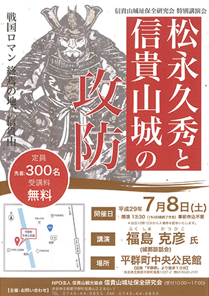 また、歴史家の先生などを招いて、講演会や現地見学会(「松永弾正久秀のロマンをたどるツアー」)などのイベントも行っています。これらのイベントには、毎回多数の方々が参加しています。このような取組の結果、信貴山城址に関心をもち、現地を訪れる人が増えています。