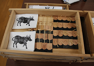 鋤・鍬のミニチュアと牛の版画