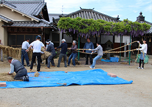 矢部の綱掛は、平成27年に田原本町の無形民俗文化財に指定されました。町の広報誌で採り上げていただいたこともあり、最近では集落外からの見学者も増えています。当日(5月5日)は、当屋の人々を中心に綱を持って集落を練り歩き、途中で慶事のあった人を綱で巻いたりした後で綱を掛けます。なお、暗黙の了解として、この行事は正午までに終わらせることになっています。この当日の様子は報道などで目にされた方も多いと思いますが、前日(5月4日)の準備の様子も、ぜひ見ていただきたいですね。当屋を中心に地域の人々が協力し合って、綱を作ったり、各家に配るための牛の版画やミニチュアの農具を作成しています。これらの作業は矢部公民館で行っていますので、どなたでも見ていただくことができます。