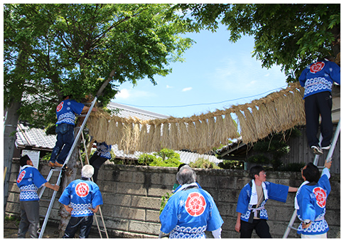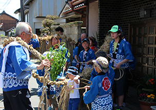 毎年5月5日に、矢部の集落で行われている風習です。地域の人々の手によって作られた綱が集落内を練り歩いた後、集落の南端にある2本の木の間に掛けられて、豊作と邪悪が入らぬことを祈願します。次の年には、また新しい綱が作られ、前年のものと掛け替えられます。当屋(とや)制度や伝承方法など、地域の人々の工夫と努力によって、今日まで受け継がれています。