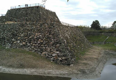 In 1585, Hidenaga, the younger brother of Toyotomi Hideyoshi, moved in and set about creating a castle befitting someone with landholdings of one million goku of rice (which is generally viewed as the equivalent of enough land to produce rice to feed one million people for a year) in Yamato Province. Large rocks were quarried from the Mizuya River at Kasuga- Taisha Shrine, and rocks that would have been used for the foundation stones of temples, five-ring pagodas, stone jizo statues, and other structures were redirected for use in the castle’s stone walls. Timbers for the castle tower were cut from Mt. Onitori. It seems that the main enclosure, Bishamon enclosure, Midori enclosure, and other compounds were built around this time. Following the death of Hidenaga, his adopted son Hideyasu also devoted himself to the construction of the castle, but he died young in 1595. Afterwards, Mashita Nagamori, one of the Five Commissioners (an administrative organ established by Toyotomi Hideyoshi) moved into the castle with land holdings of 200,000 goku of rice, and started work on the construction of the outer moat. The flow of the Akishino River was diverted to the east and fed into the Saho River, and the original river site was used for the outer moat. Using a reservoir on the west side, a moat was built along a depression on the north side. In addition, an embankment was built on the inner side of the moat.