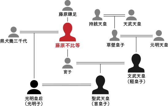 697年、不比等の娘宮子が文武天皇の妃となったことにより、不比等は天皇家の外戚(=母方の親戚)として着々と藤原氏の権力基盤を築いていきます。