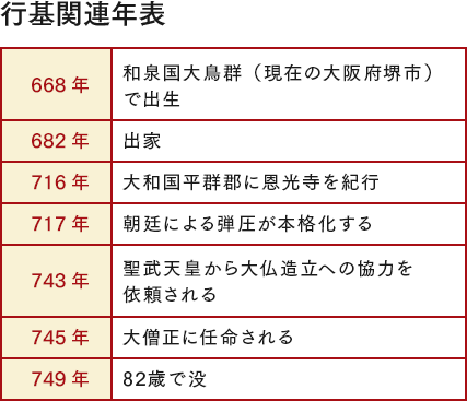 行基は668年、和泉国大鳥郡(現在の大阪府堺市)で生まれました。15歳で出家したのち、仏道修行を経て、民間布教や社会事業に尽力します。後に聖武天皇の帰依を受け、東大寺の大仏造立に奔走、ついには、日本最初の大僧正の位を授けられました。