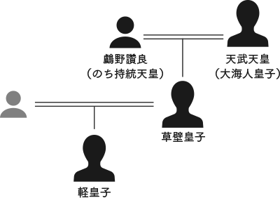 持統天皇は即位前の名を鸕野讃良皇女(うののさららのひめみこ)といい、父は大化の改新を実行した中大兄皇子です。13歳のときに大海人皇子(中大兄皇子の弟)の妃となり、壬申の乱(672年)を経て大海人皇子が即位すると(天武天皇)、その皇后に立てられました。天武天皇の崩御後しばらくして即位し、飛鳥浄御原令の実施徹底をはかり、藤原京を造営して新しい都としました。