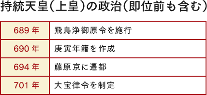 持統天皇は、律令を制定し、戸籍を整備し、本格的な都を造営するなど、我が国の政治の礎を築きました。特に、701年の大宝律令は、「律」(刑罰に関する規定)と「令」(行政組織や租税・労役に関する規定)が揃っている、我が国初の本格的な法典でした。また、律令の整備に合わせて、我が国の呼び方(国号)が「倭」から「日本」に決まりました。