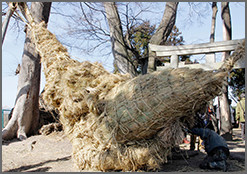 엣쓰미의 가스가 신사에서 남자 밧줄을, 오니시의 이치키시마 신사에서 여자 밧줄을 만드는데, 밧줄의 무게는 각각 700kg가량이나 됩니다. 그 무거운 밧줄을 스사노오 신사까지 운반하여 합체시켜 나무에 매단 후에 축하 행사를 거행합니다.