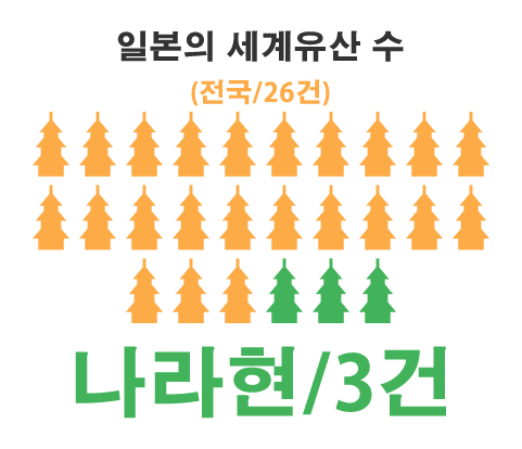 현재 일본에는 26건의 세계유산이 등재되어 있는데, 그중 3건(‘호류지 지역의 불교건조물’, ‘고대 나라의 문화재’, ‘기이산지의 영지와 참배길’)이 나라현에 있으며, 1건(‘아스카·후지와라 궁’)이 잠정 목록에 등재되어 있습니다.