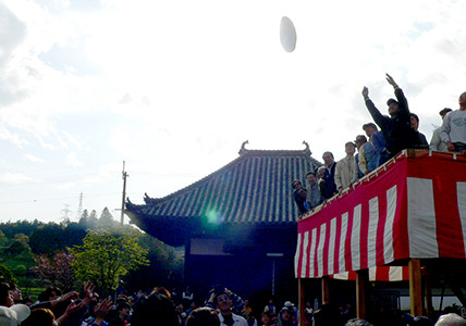 大淀町は、古くから大和盆地と吉野地方を結ぶ交通の要衝として栄えた町です。町東部の上比曽地区には聖徳太子により創建されたと伝えられる世尊寺があります。世尊寺では、毎年4月29日に聖徳太子の徳をたたえる盛大な会式「おたいっさん」が開かれます。この「おたいっさん」は、大淀町、世尊寺奉賛会の方々、町民の方々が一体となって地域ぐるみで行われる町内有数のイベントとなっています。「おたいっさん」のクライマックスは、投げ台からのゴクまき(餅まき)です。特に、重さ6kgほどもあるゴク(カサゴク)が宙を舞う姿は必見です。