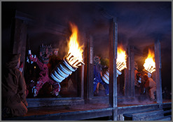 届时,将有三只“鬼”手持燃烧的火把,在堂内绕场三周,为人们消灾解厄。