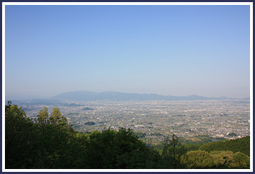 照片是櫻井至天理市的大和古墳群的空拍圖。左下方是箸墓古墳(倭跡跡日百襲姬命墓)。其上方分別是澀谷向山古墳(景行天皇陵)、行燈山古墳(崇神天皇陵)、西殿塚古墳(手白香皇女陵)等。