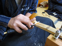 味削り。穂先となる部分を湯に浸し、穂の内側を根元から先になるほど薄くなるように削ります。