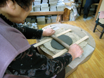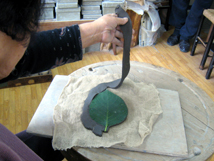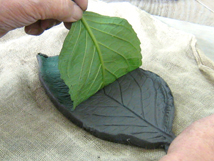 葉を剥がした後で指の跡が付かないように布越しに優しく淵を盛り上げると木の葉の形そのものの器が成形されます。
