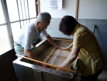 1.漉船の中に山の水と原料の楮とノリを混ぜて前後に揺さぶりながら紙を漉きます。