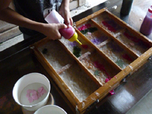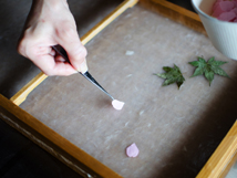 2.漉いた上に紅葉や花びらをのせてオリジナルの和紙を作ります。