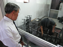 職人が墨を窓越しに体験者に渡します。指紋が付くようにしっかりにぎって下さい。