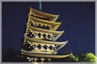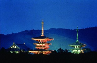 1998年に世界遺産に登録された興福寺にある五重塔は、古都奈良のシンボルとして親しまれています。深い松の緑の中から夜空に向かってそびえ立つ荘重な姿は、見る者に感銘を与えます。※興福寺五重塔のライトアップは、令和5年8月21日から当面の間、休止します。