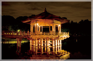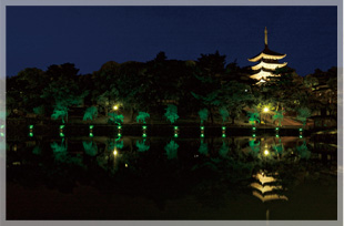 池のほとりに植えられた柳とともに興福寺五重塔が水面に影を落とす情緒ある夜景。また、池に映る月は奈良八景のひとつとして有名。毎年、中秋の名月の日には池の北西にある采女神社の采女祭(※)が催されます。