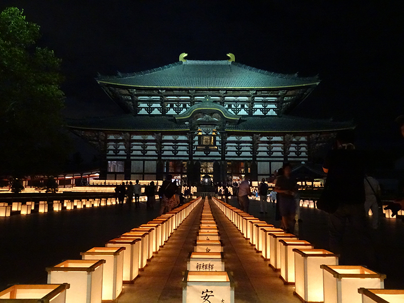 東大寺大仏殿では8月13日、14日に夜間拝観(無料)が行われます(19時00分~21時00分)。また、8月15日の万灯供養会では法要を厳修して諸霊を供養し、大仏殿のまわりに2,500基ほどの灯籠が並べられます(19時00分~21時30分)。