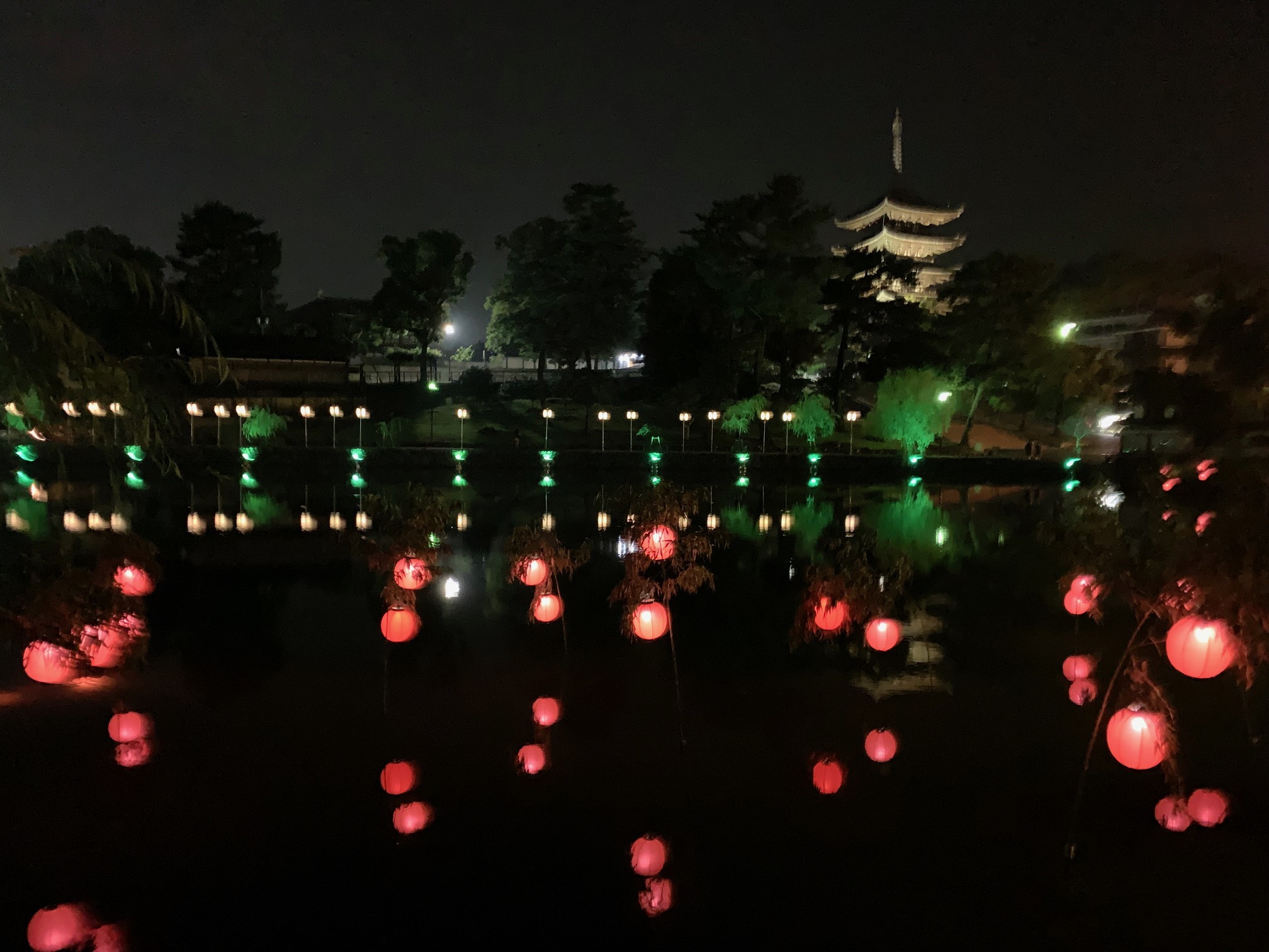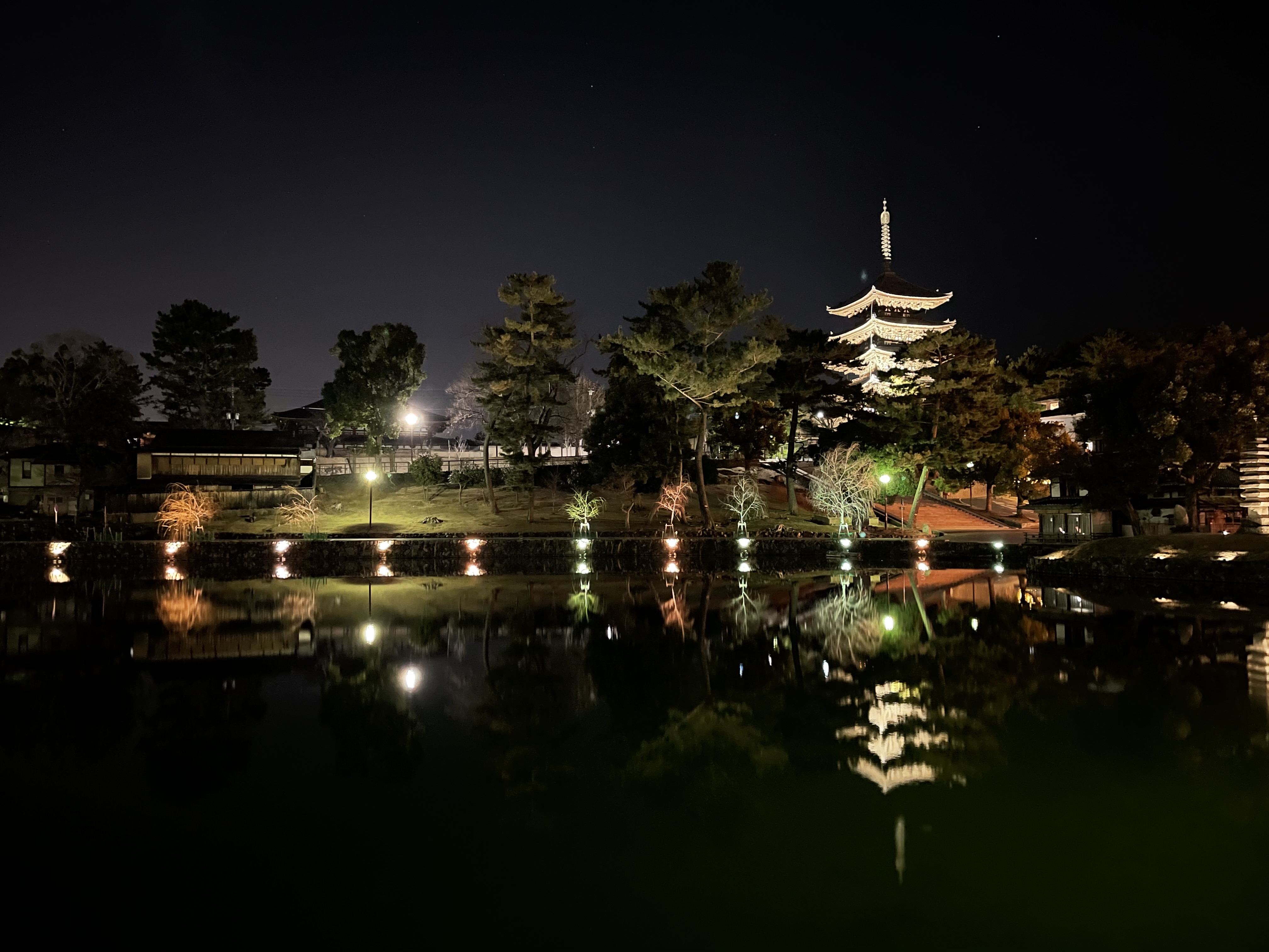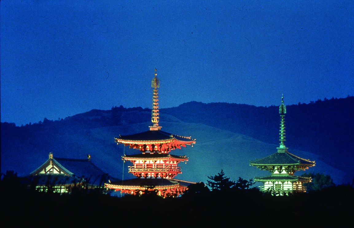 眩い光で包まれた、西塔と東塔が西の京の夜空に並びます。西側の大池越しの眺めは絶景です。