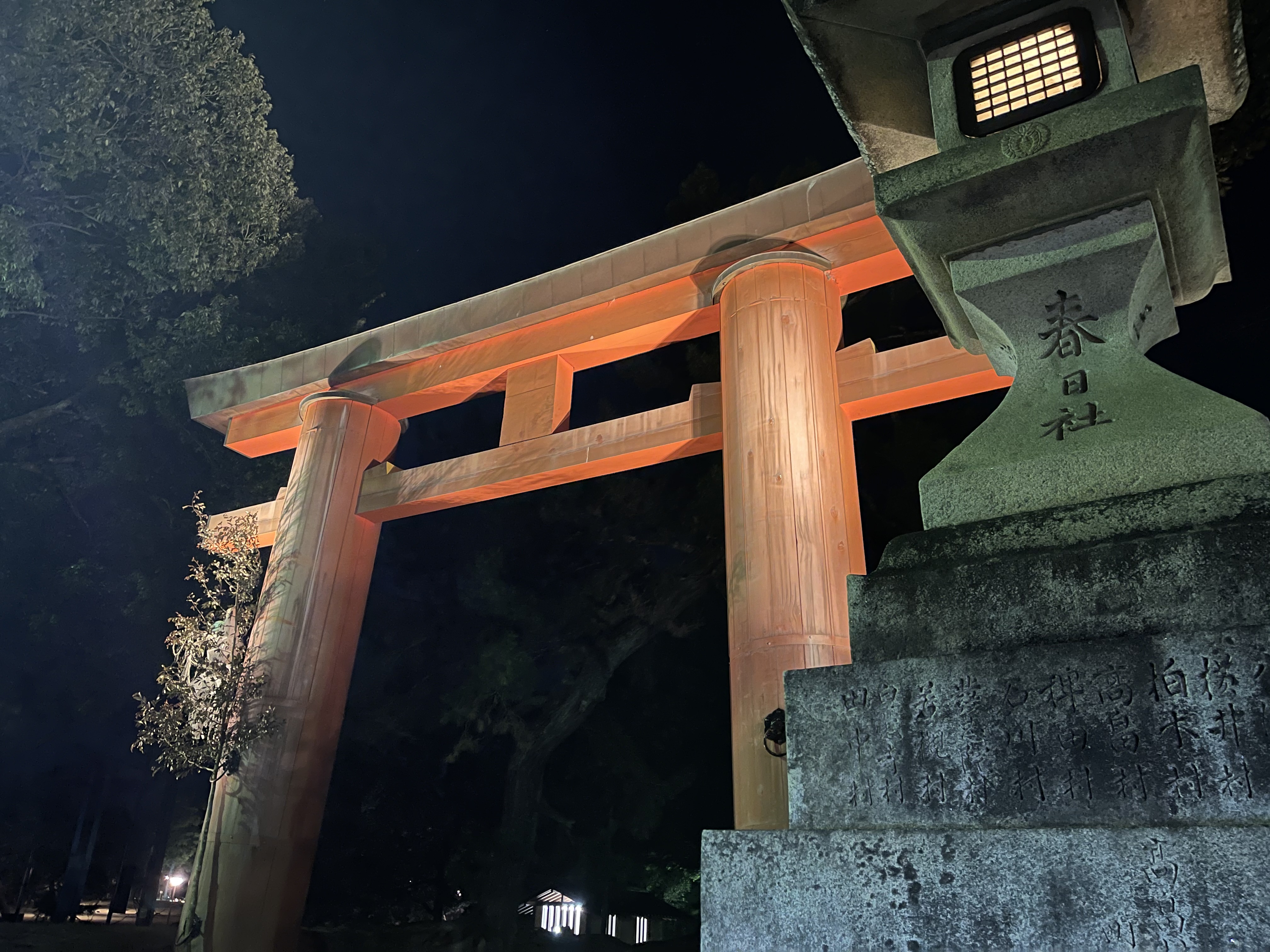 春⽇⼤社の表⽞関、⼀之⿃居。俗界との境である⿃居は、神社を象徴する神聖な場所で、夜空に映える朱⾊の堂々たる姿は、圧倒的な存在感です。