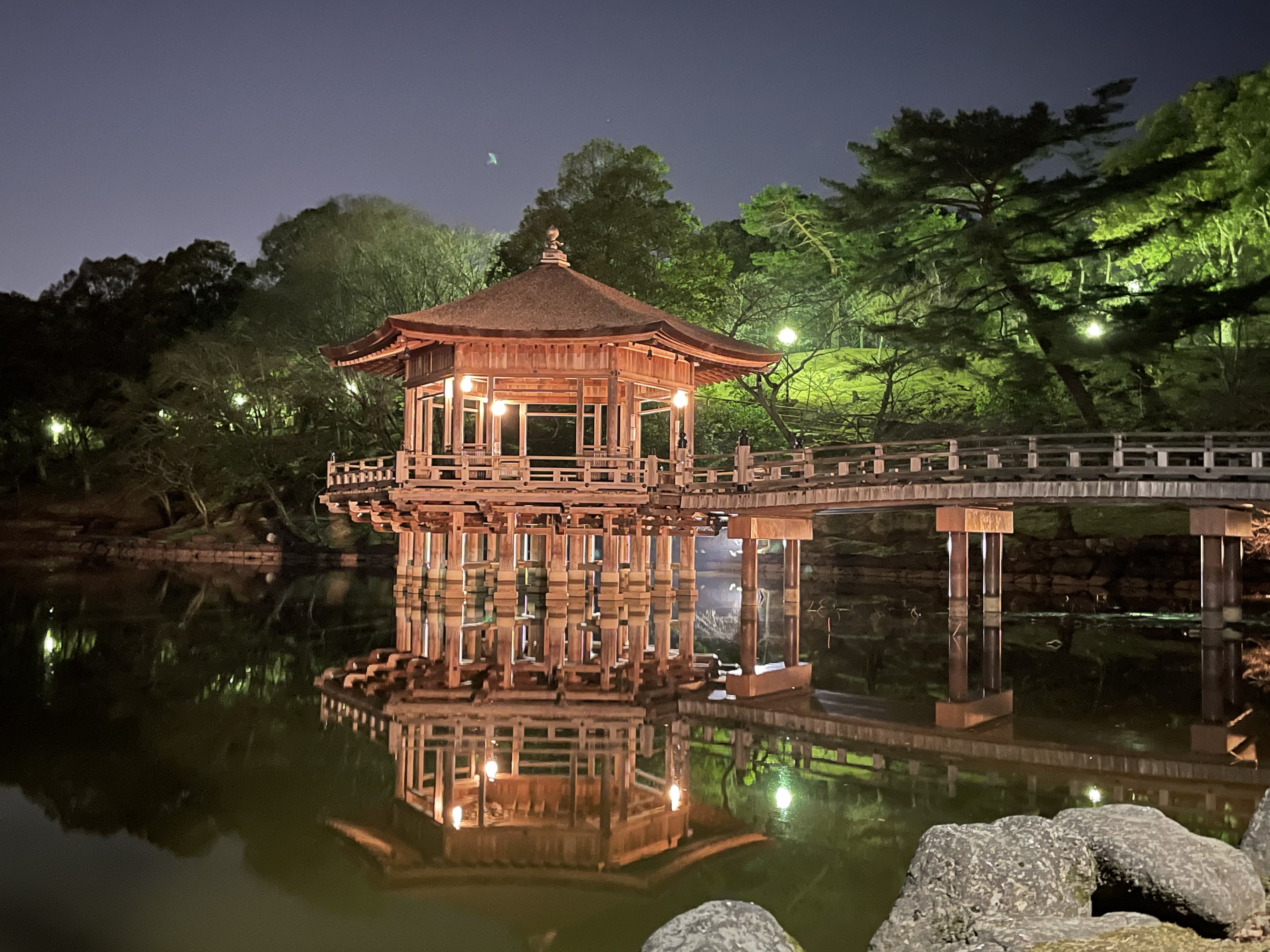 奈良公園内の鷺池に建つ六⾓形の建物。春には桜、秋には紅葉等、季節によって違った姿を⾒せてくれます。⽔⾯に映る姿は幻想的で、ロマンチックな雰囲気を味わえます。