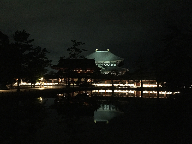 世界最⼤級の⽊造建築である奈良のシンボル⼤仏殿。鏡池越しの姿は必⾒です。ライトアップされた南⼤⾨の⾦剛⼒⼠像は、迫⼒があり、息を呑みます。