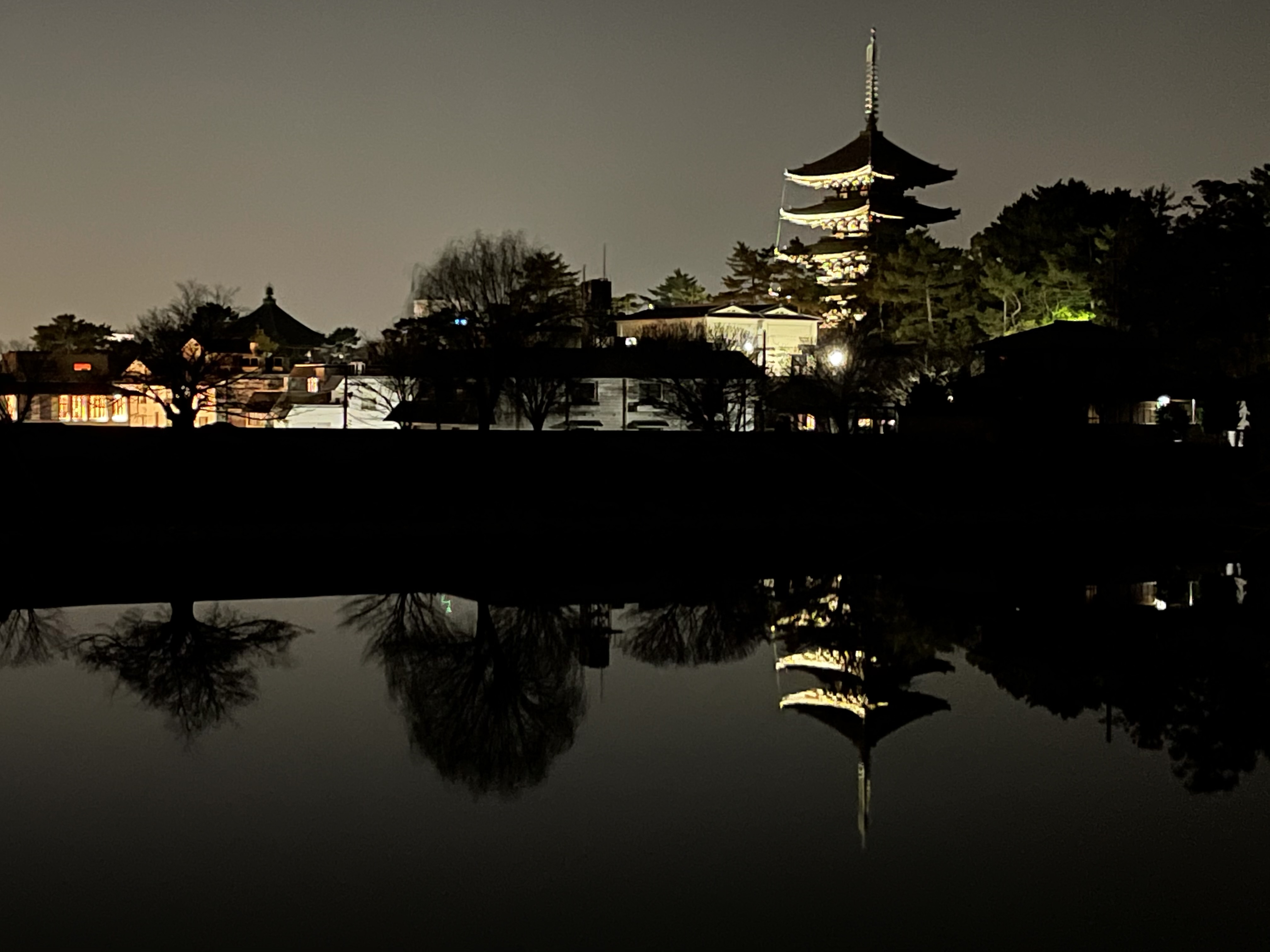 春日大社一之鳥居から少し歩くと、道路の両側に見えてくるのが荒池。その東側から池越しに興福寺五重塔を望むことができます。