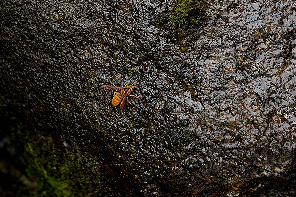 溢れる「延命水」を飲む蜂を発見。やはり、ご利益を求めてのことだろう。