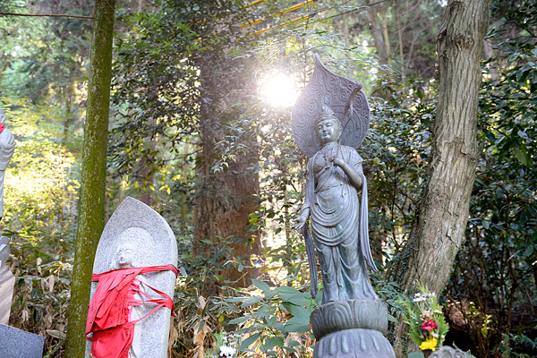 「延命水」がある場所から「多宝塔」への道。左右には寄進されたお地蔵様が並ぶ。この辺りから、「多宝塔」や「奥の院」へと続く道は、葉の茂る木々に囲まれ日中でも日陰となることが多い。木々の香りや木漏れ日などを感じて歩くと、宝山寺が山岳に建てられた寺院であることをより強く実感することができる。