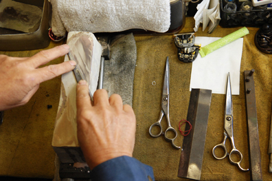 日本の鋏の大半は、コンピューター制御によって機械的に製造されている。材質や作りは世界一。にも関わらず、その中には「切れない」鋏もあるという。「ならば磨けばよいのでは」と思いがちだが、根矢さん曰く、「鋏には、切れるための条件がある」とのこと。「アール(曲がり具合)、ひねり、触面(点)、これら3つを調整してやれば、新品以上の切れ味に“直せ”ます」。