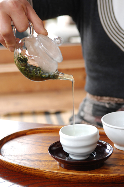 吹き抜けの店内に陽光が降り注ぎ、湯飲みから柔らかな湯気が立ち上る。「7、8割がた、茶葉が開いたところで1煎目をどうぞ」。馥郁とした香りと共に、かぶせ茶の豊かな甘みを味わう。ほっとして、心が緩む。
