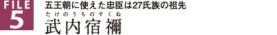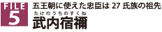 景行・成務・仲哀・応神・仁徳天皇の歴朝を支えたとされる伝説上の人物。孝元天皇の孫または曾孫と伝えられ、子供である七人の男子が巨勢・蘇我・葛城・平群・紀氏ら27氏族の祖となったという。