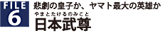 景行天皇の皇子で、幼名は小碓尊(おうすのみこと)または日本童男(やまとおぐな)といった伝説上の人物。日本武尊の名は、尊が討った熊襲の首長が死の間際に献呈した尊称で、“大和の勇者”を表す。